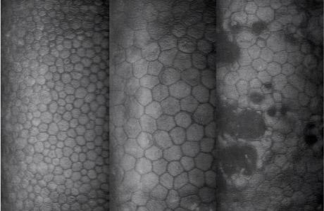 Como se puede observar en la imagen, vemos como la primera fotografía se corresponde con una capa endotelial normal, sin alteraciones. En la segunda, debido a la pérdida de células endoteliales, las que quedan se hacen más grandes para ocupar el espacio de las que han muerto y por eso son de mayor tamaño. Y en la última se puede observar como existen zonas con puntos negros (zona en la que ya no hay células endoteliales), y como consecuencia se produce pérdida de transparencia en la córnea.